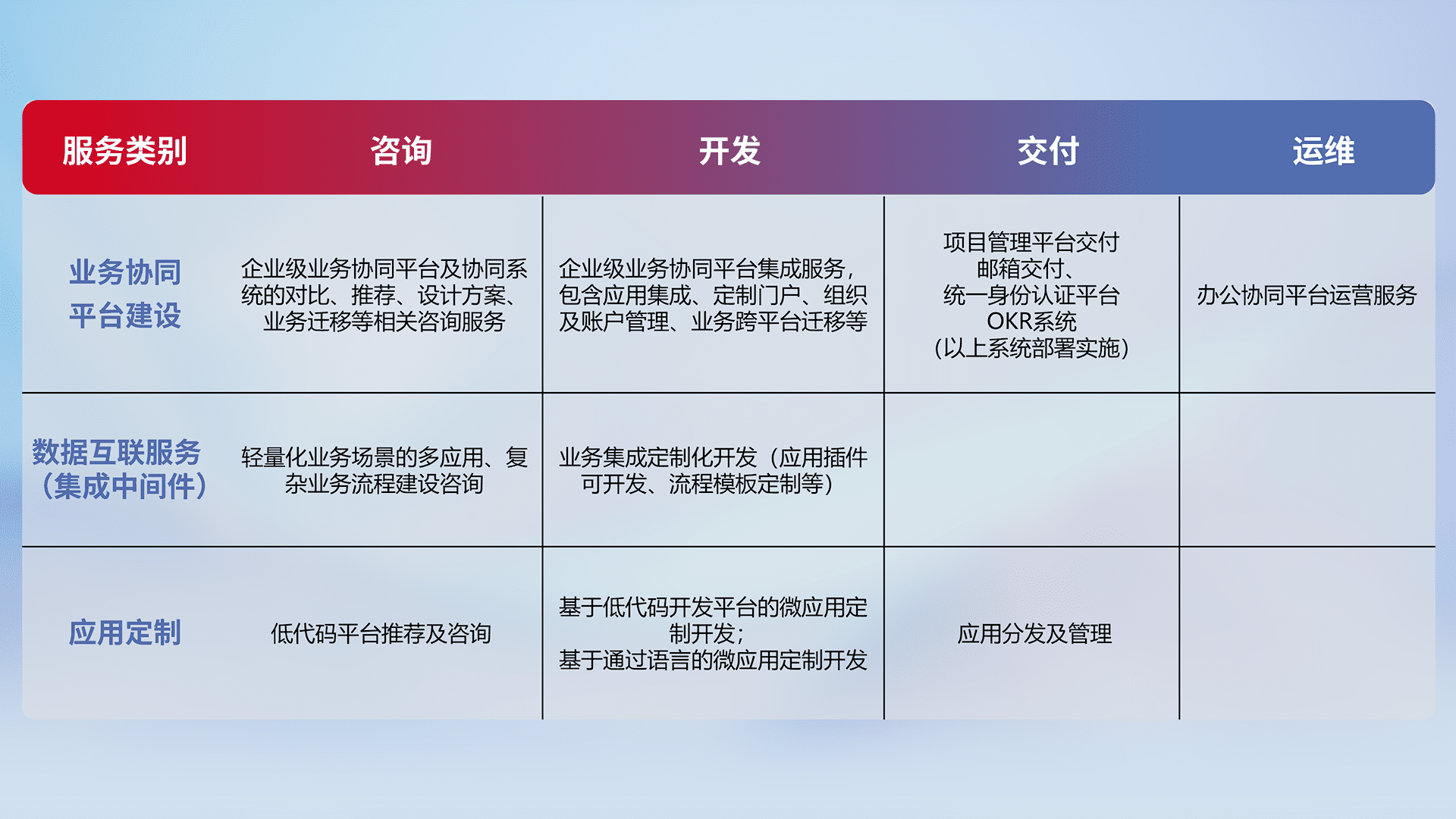 针对钉钉、、、、企微、、、IDaas等平台级产品提供产品的规划、、、方案、、、交付、、定制化开发等服务,,,实现如统一协同办公、、、智能客户服务、、混合会议管理、、、、智能数据查询、、等业务场景,,,实现数字化转型。。。。